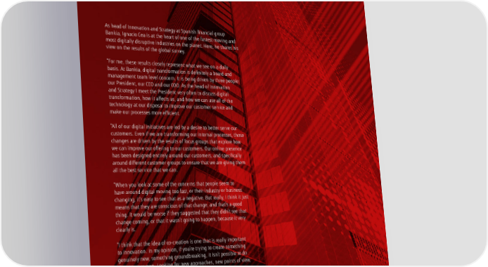 The disruption opportunity: an expert opinion As head of Innovation and Strategy at Spanish financial group Bankia, Ignacio Cea is at the heart of one of the fastest moving and most digitally disruptive industries on the planet. Here, he shares his view on the results of the global survey. “For me, these results closely represent what we see on a daily basis. At Bankia, digital transformation is definitely a board and management team level concern. It is being driven by three people: our President, our CEO and our COO. As the head of Innovation and Strategy I meet the President very often to discuss digital transformation, how it affects us, and how we can use all of the technology at our disposal to improve our customer service and make our processes more efficient. “All of our digital initiatives are led by a desire to better serve our customers. Even if we are transforming our internal processes, those changes are driven by the results of focus groups that explore how we can improve our offering to our customers. Our online presence has been designed entirely around our customers, and specifically around different customer groups to ensure that we are giving them all the best service that we can. “When you look at some of the concerns that people seem to have around digital moving too fast, or their industry or business changing, it’s easy to see that as a negative. But really, I think it just means that they are conscious of that change, and that’s a good thing. It would be worse if they suggested that they didn’t see that change coming, or that it wasn’t going to happen, because it very clearly is. “I think that the idea of co-creation is one that is really important to innovation. In my opinion, if you’re trying to create something genuinely new, something groundbreaking, it isn’t possible to do that on your own. Looking for new approaches, new points of view, new partners - that’s how you help your business improve. “Some of the new products and services that we are testing with the market aren’t ideas that you’d expect to come from a bank. That’s “All of our digital initiatives are because they’re based on the insight and experiences of partners from outside of the finance industry, and that adds huge value for led by a desire to better serve us.” our customers.” Ignacio Cea Chief Strategy and Innovation Officer, Bankia 15
