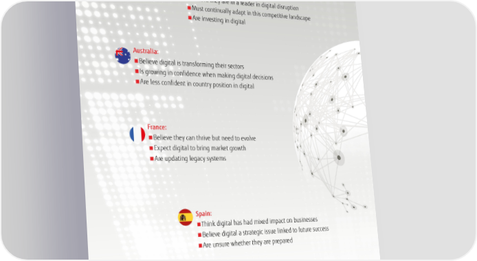 The Global View in summary US: ■ Believe they are in a leader in digital disruption ■ Must continually adapt in this competitive landscape ■ Are investing in digital Australia: ■ Believe digital is transforming their sectors ■ Is growing in confidence when making digital decisions ■ Are less confident in country position in digital France: ■ Believe they can thrive but need to evolve ■ Expect digital to bring market growth ■ Are updating legacy systems Spain: ■ Think digital has had mixed impact on businesses ■ Believe digital a strategic issue linked to future success ■ Are unsure whether they are prepared Italy: ■ Need agile change and more innovation to thrive ■ Believe most of their businesses will be fundamentally different in 5 years ■ Feel lack of investment and aging technology restricting success 16