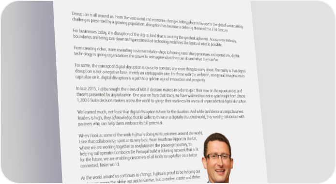 Introduction Disruption is all around us. From the vast social and economic changes taking place in Europe to the global sustainability challenges presented by a growing population, disruption has become a defining theme of the 21st Century. For businesses today, it is disruption of the digital kind that is creating the greatest upheaval. Across every industry, boundaries are being torn down as hyperconnected technology redefines the limits of what is possible. From creating richer, more rewarding customer relationships to honing razor sharp processes and operations, digital technology is giving organizations the power to reimagine what they can do and what they can be. For some, the concept of digital disruption is cause for concern: one more thing to worry about. The reality is that digital disruption is not a negative force, merely an unstoppable one. For those with the ambition, energy and imagination to capitalize on it, digital disruption is a path to a golden age of innovation and prosperity. In late 2015, Fujitsu sought the views of 600 IT decision makers in order to gain their view on the opportunities and threats presented by digitalization. One year on from that study, we have widened our net to gain insight from almost 1,200 C-Suite decision makers across the world to gauge their readiness for an era of unprecedented digital disruption. We learned much, not least that digital disruption is here for the duration. And while confidence amongst business leaders is high, they acknowledge that in order to thrive in a digitally disrupted world, they need to collaborate with partners who can help them embrace its full potential. When I look at some of the work Fujitsu is doing with customers around the world, I see that collaborative spirit at its very best. From Heathrow Airport in the UK, where we are working together to revolutionize the passenger journey, to helping rail operator Comboios De Portugal build a ticketing network that is fit for the future, we are enabling customers of all kinds to capitalize on a better connected, faster world. As the world around us continues to change, Fujitsu is proud to be helping our customers across the globe not just to survive, but to evolve, create and thrive. Duncan Tait CEO, SEVP and Head of Americas and EMEIA, Fujitsu 5