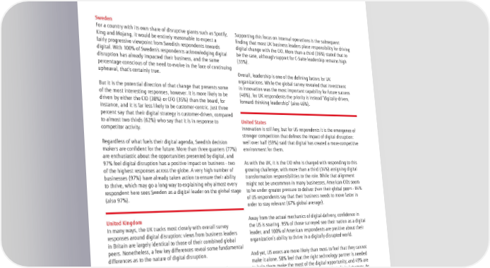 Sweden For a country with its own share of disruptive giants such as Spotify, Supporting this focus on internal operations is the subsequent King and Mojang, it would be entirely reasonable to expect a finding that most UK business leaders place responsibility for driving fairly progressive viewpoint from Swedish respondents towards digital change with the CIO. More than a third (36%) stated that to digital. With 100% of Sweden’s respondents acknowledging digital be the case, although support for C-Suite leadership remains high disruption has already impacted their business, and the same (33%). percentage conscious of the need to evolve in the face of continuing upheaval, that’s certainly true. Overall, leadership is one of the defining factors for UK organizations. While the global survey revealed that investment But it is the potential direction of that change that presents some in innovation was the most important capability for future success of the most interesting responses, however. It is more likely to be (46%), for UK respondents the priority is instead “digitally-driven, driven by either the CIO (38%) or CFO (35%) than the board, for forward thinking leadership” (also 46%). instance, and it is far less likely to be customer-centric. Just three percent say that their digital strategy is customer-driven, compared to almost two thirds (62%) who say that it is in response to United States competitor activity. Innovation is still key, but for US respondents it is the emergence of stronger competition that defines the impact of digital disruption: Regardless of what fuels their digital agenda, Swedish decision well over half (59%) said that digital has created a more competitive makers are confident for the future. More than three quarters (77%) environment for them. are enthusiastic about the opportunities presented by digital, and 97% feel digital disruption has a positive impact on business - two As with the UK, it is the CIO who is charged with responding to this of the highest responses across the globe. A very high number of growing challenge, with more than a third (34%) assigning digital businesses (97%) have already taken action to ensure their ability transformation responsibilities to the role. While that alignment to thrive, which may go a long way to explaining why almost every might not be uncommon in many businesses, American CIOs seem respondent here sees Sweden as a digital leader on the global stage to be under greater pressure to deliver than their global peers - 84% (also 97%). of US respondents say that their business needs to move faster in order to stay relevant (67% global average). United Kingdom Away from the actual mechanics of digital delivery, confidence in In many ways, the UK tracks most closely with overall survey the US is soaring. 95% of those surveyed see their nation as a digital responses around digital disruption: views from business leaders leader, and 100% of American respondents are positive about their in Britain are largely identical to those of their combined global organization’s ability to thrive in a digitally disrupted world. peers. Nonetheless, a few key differences reveal some fundamental differences as to the nature of digital disruption. And yet, US execs are more likely than most to feel that they cannot make it alone. 58% feel that the right technology partner is needed Chief amongst these is what digital disruption represented to a to help them make the most of the digital opportunity, and 49% are UK audience. While for most business leaders across the globe it looking for a partner to help them co-create their digital strategy. As represents the chance to transform business models and revenue a nation, only Germany places more emphasis on this collaborative streams, UK respondents associate digital disruption with the approach. remodeling of processes and operations (25% / 27% global). 14