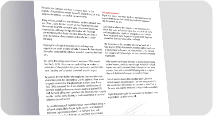 Digital Disruption: the new normal The world has changed, and there is no going back. For the Disruption is not done majority of organizations around the world, digital disruption is no Digital may already have had a significant impact on the way that longer an impending concern but the new normal. organizations operate, but - to the chagrin of some respondents - the disruption is not over. Every industry, and almost every business, has been affected. Nine out of ten C-Suite decision makers say that digital has disrupted Questioned on whether they expected to see future disruption their sector, with 98% saying the same of their own business or within their sector and to what extent if so, more than half (54%) organization. Although it might not be clear why this small said they believe that “significant” change lies ahead, trailed by minority believe that digital has passed them by, one thing is those who project “some” degree of disruption (39%). Only three clear: the number of organizations left unaffected is rapidly percent feel that their sector will be unaffected. shrinking. The implications of this continuing upheaval are keenly felt. A If going through digital disruption serves to bring many large majority (81%) of respondents recognize digital disruption as organizations under a single umbrella, however, the form that this a “positive force for business”, with three quarters (74%) stressing disruption takes and their attitude towards it separates them back that change resulting from digital has been beneficial to their own out. organization. For some, this simply comes down to sentiment. While around While experiences of digital disruption to date have been broadly two-thirds (67%) of respondents say that they are “excited or positive however, worries do creep through. Almost half (43%) of enthusiastic” about digital disruption, for instance, one fifth (20%) respondents say that the level of digital disruption in their sector note that they are “concerned or worried” about its impact. concerns them, with one third (34%) going so far as to say that they wish that their industry was immune to its impact. Responses diversify further when exploring the associations that digital disruption has amongst our C-Level audience. When asked Overall, business leaders demonstrate a realistic, balanced to specify what digital disruption means to them, more than a attitude towards digital disruption. They have an appreciation for third (37%) answered that it was about the transformation of the opportunities it has created and continues to present but, at business models and revenue streams. Around a quarter (27%) the same time, express concern about its potential consequences. said the same of business operations and processes, with a slightly smaller number (23%) looking to the transformation of customer Digital disruption may be the new normal, but that doesn’t mean relationships and service. organizations can afford to stay still. As could be expected, digital disruption means different things to different people, likely shaped by the specific circumstances of their own organization and sector. At the same time, with significant support for its impact on everything from customer loyalty to process improvement, digital is now one of the defining factors in transforming the way in which businesses operate. of executives say digital has disrupted their organization 8